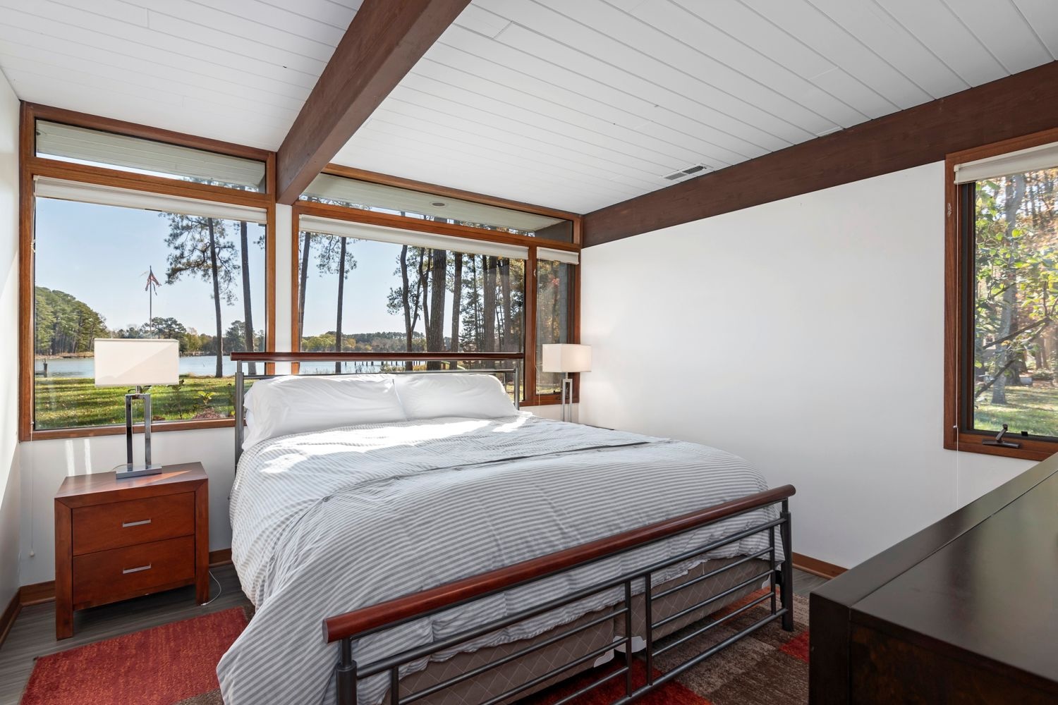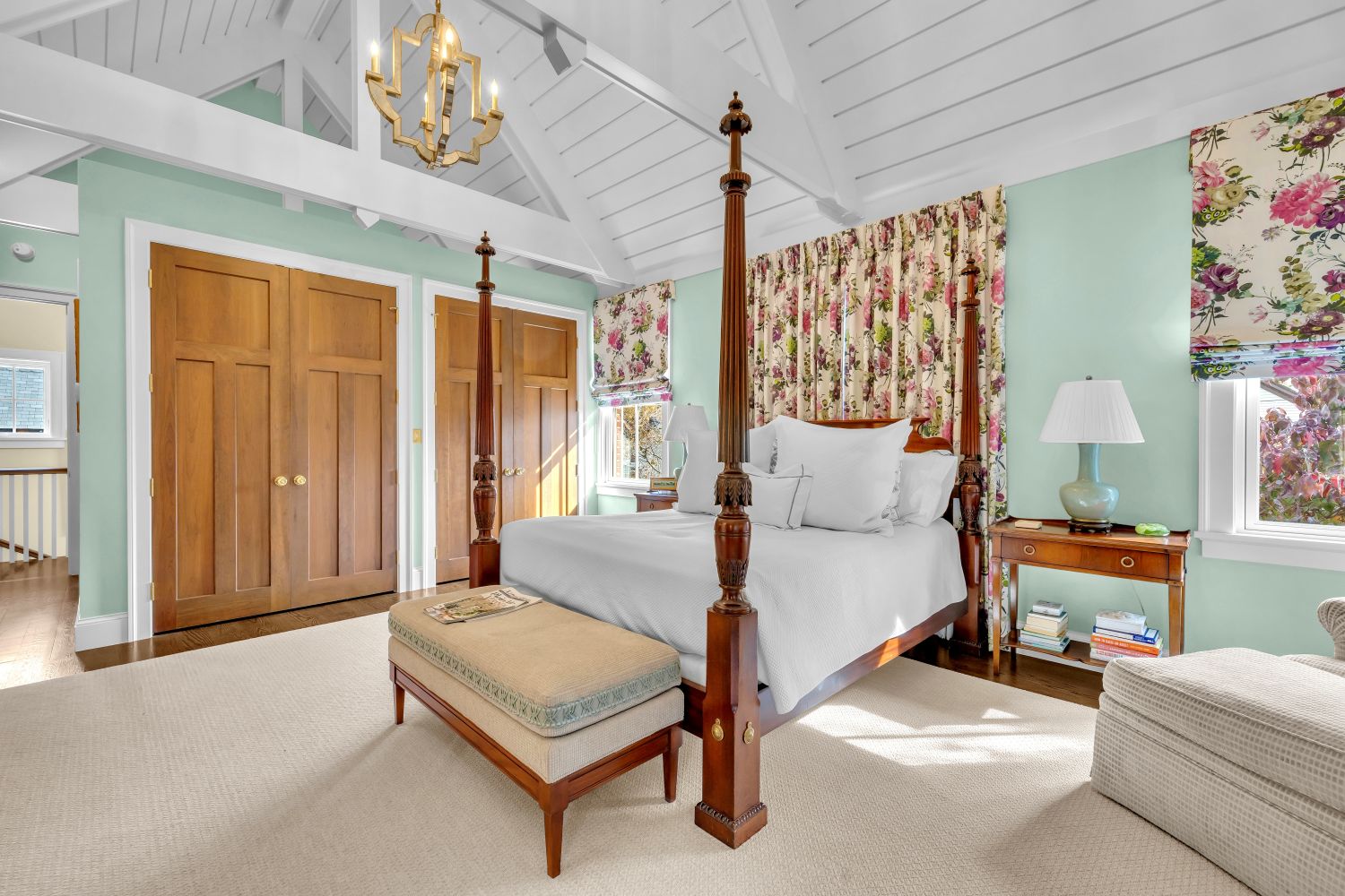 I was relieved that the second floor’s primary ensuite’s interior architecture of the white exposed trusses and decking has remained. I loved the Owner’s selection of soothing light green walls and the window treatments of large scale roses on a cream colored background. Her clever use of the same fabric to cover the existing window becomes a backdrop for the beautiful wood four-poster bed.