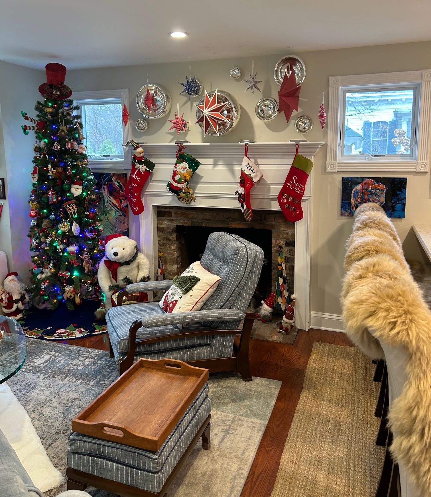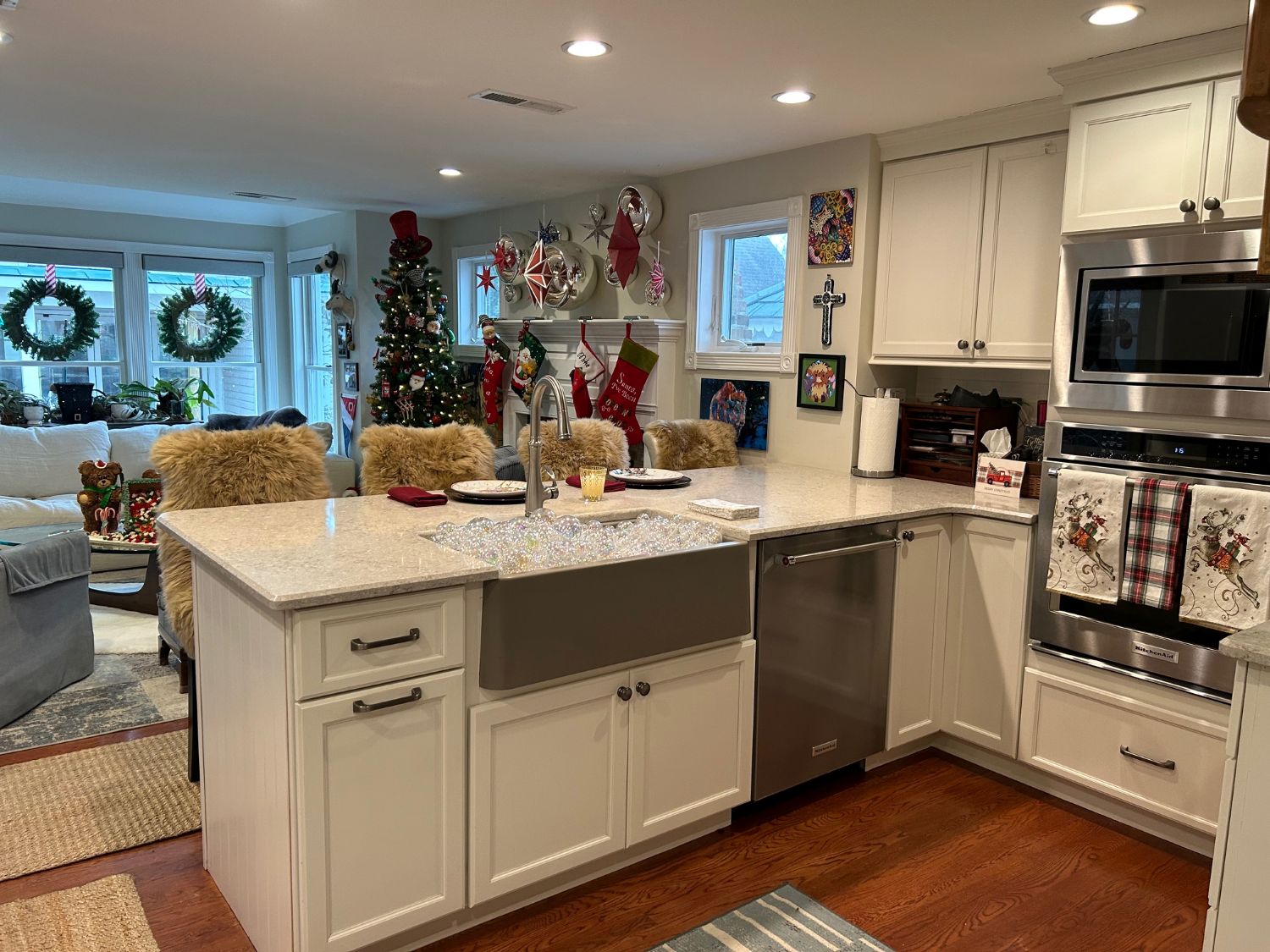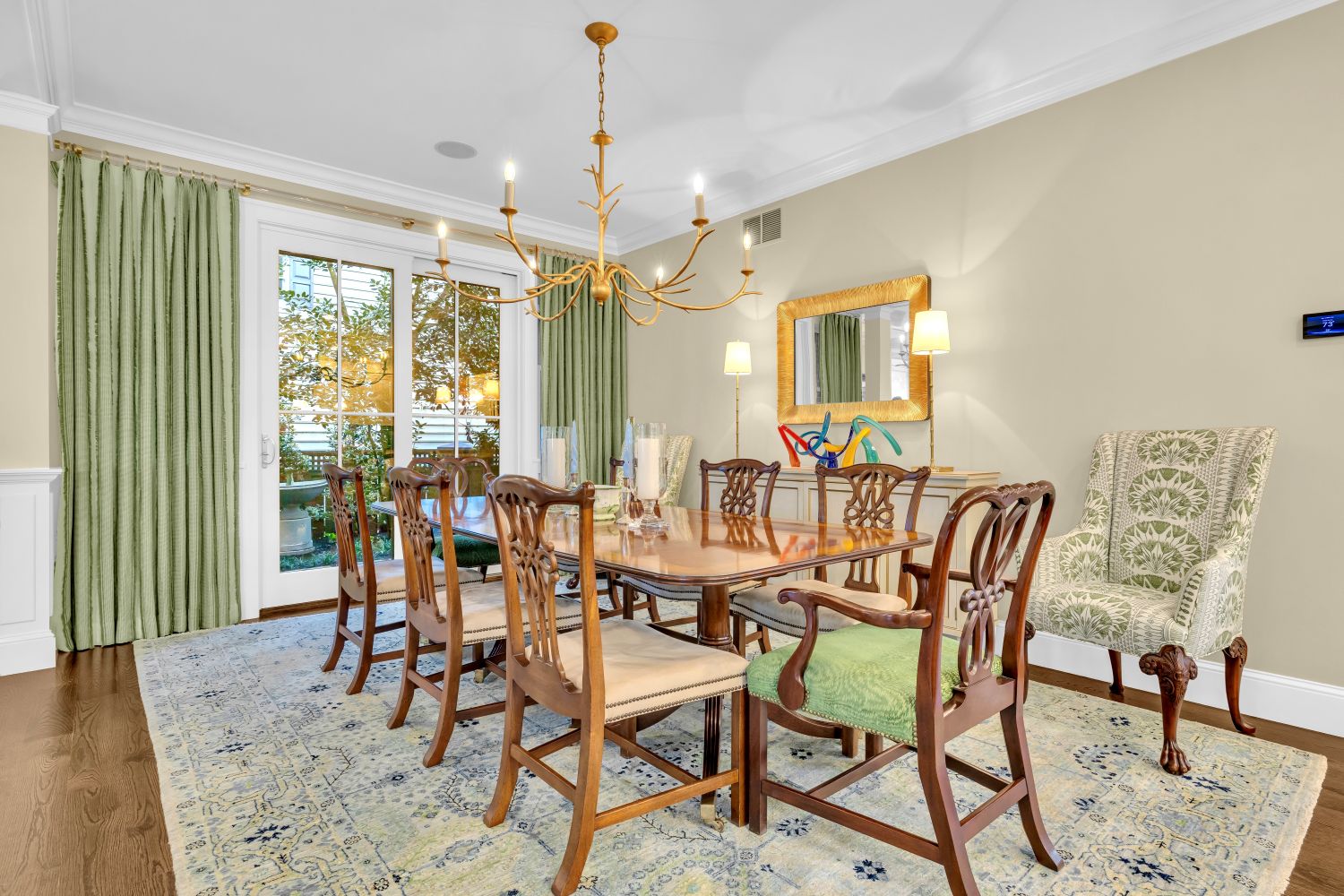 When the Owner greeted me at the original magnificent pair of walnut doors with their beautiful mahogany stain, I could see the living room’s former coffered ceiling was now brighter with the simple switch from black to white housings for the recessed lighting and white semi-gloss paint on the ceiling. I had loved the former sleek modern living room but this Owner’s transitional style is equally appealing. The green and white color scheme and the reupholstery of several pieces gives this space a fresh look and I especially admired the floral fabric from Scalamadre. New window treatments of both drapes that span to the underside of the coffered ceiling and up/down translucent shades offer various degrees of privacy. I also noticed the interior solid cherry doors now have solid brass door hinges, knobs, locks and ball catches.