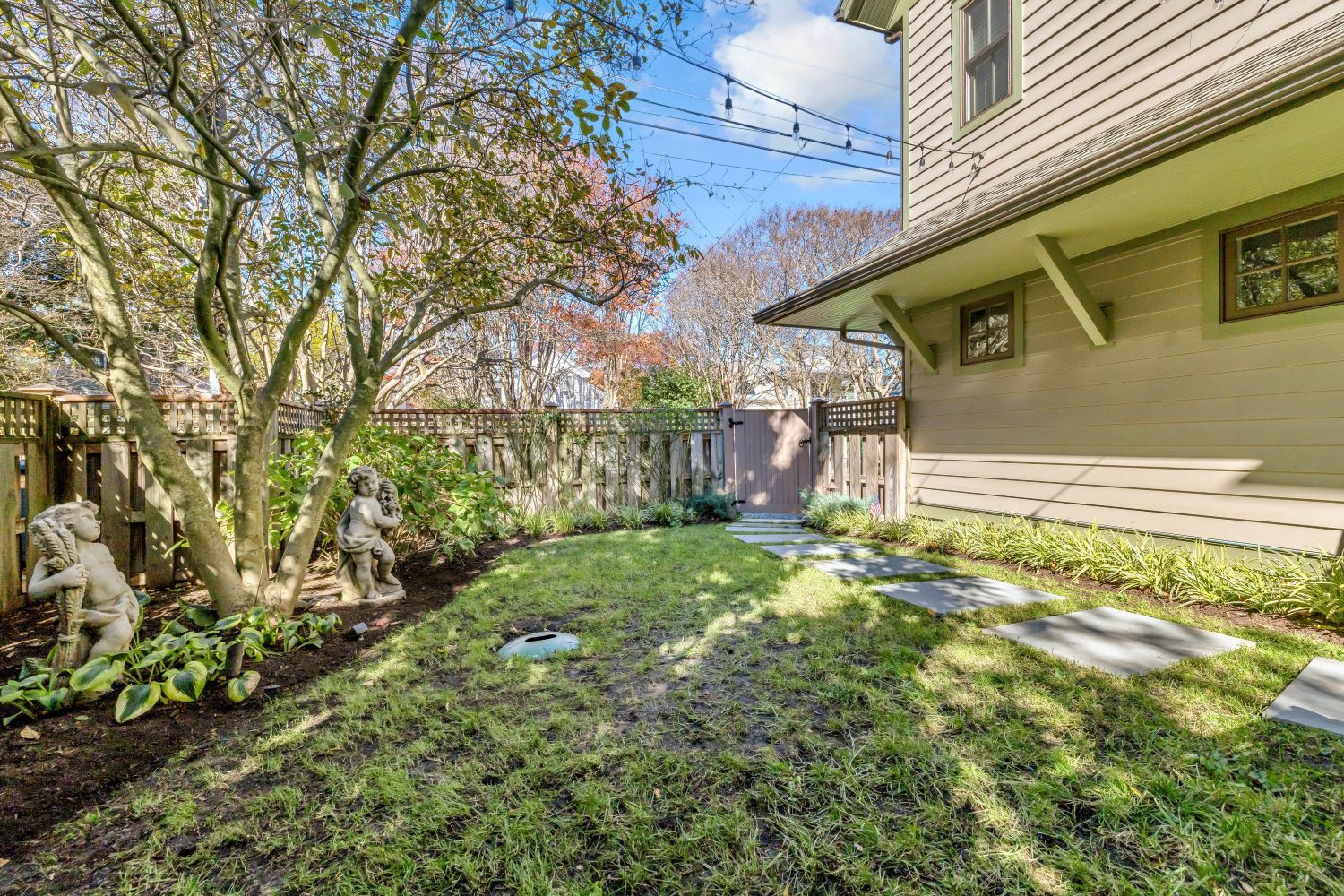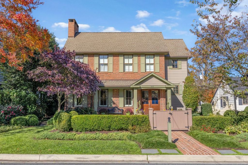 Brick herringbone pathways and a gated hedge border add structure and privacy to the inviting front façade.