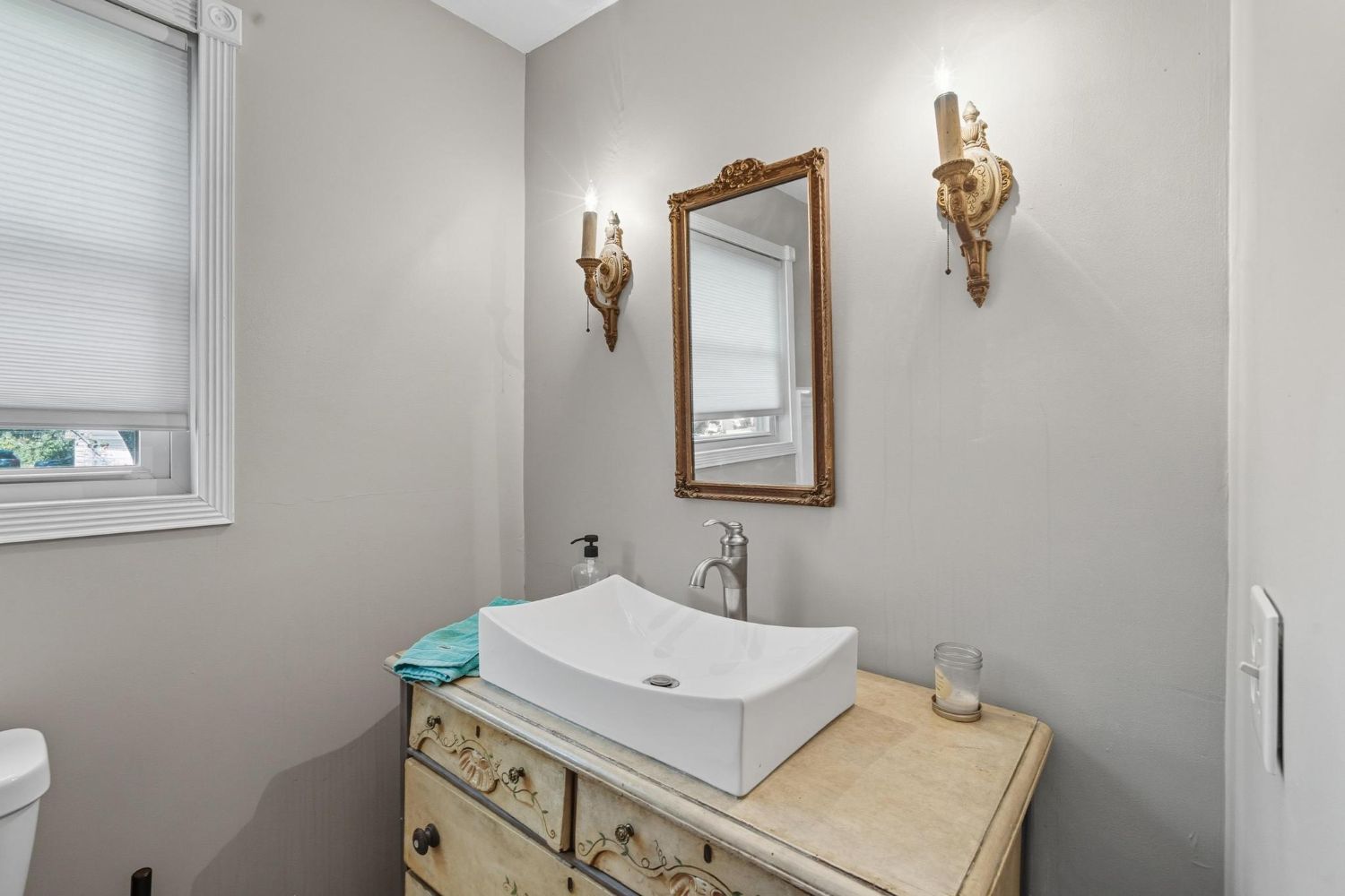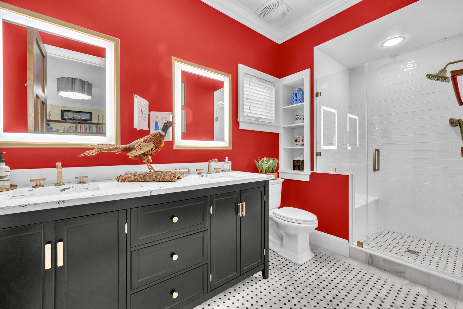 Bathroom changes are easy to do when the arrangement of the fixtures and the floor tile remains the same as it does here. The Owner added red paint to echo the adjoining room’s millwork, replaced the white cabinet doors with black doors and bronze hardware, and retiled the shower wall to remove the former accent band of tile.