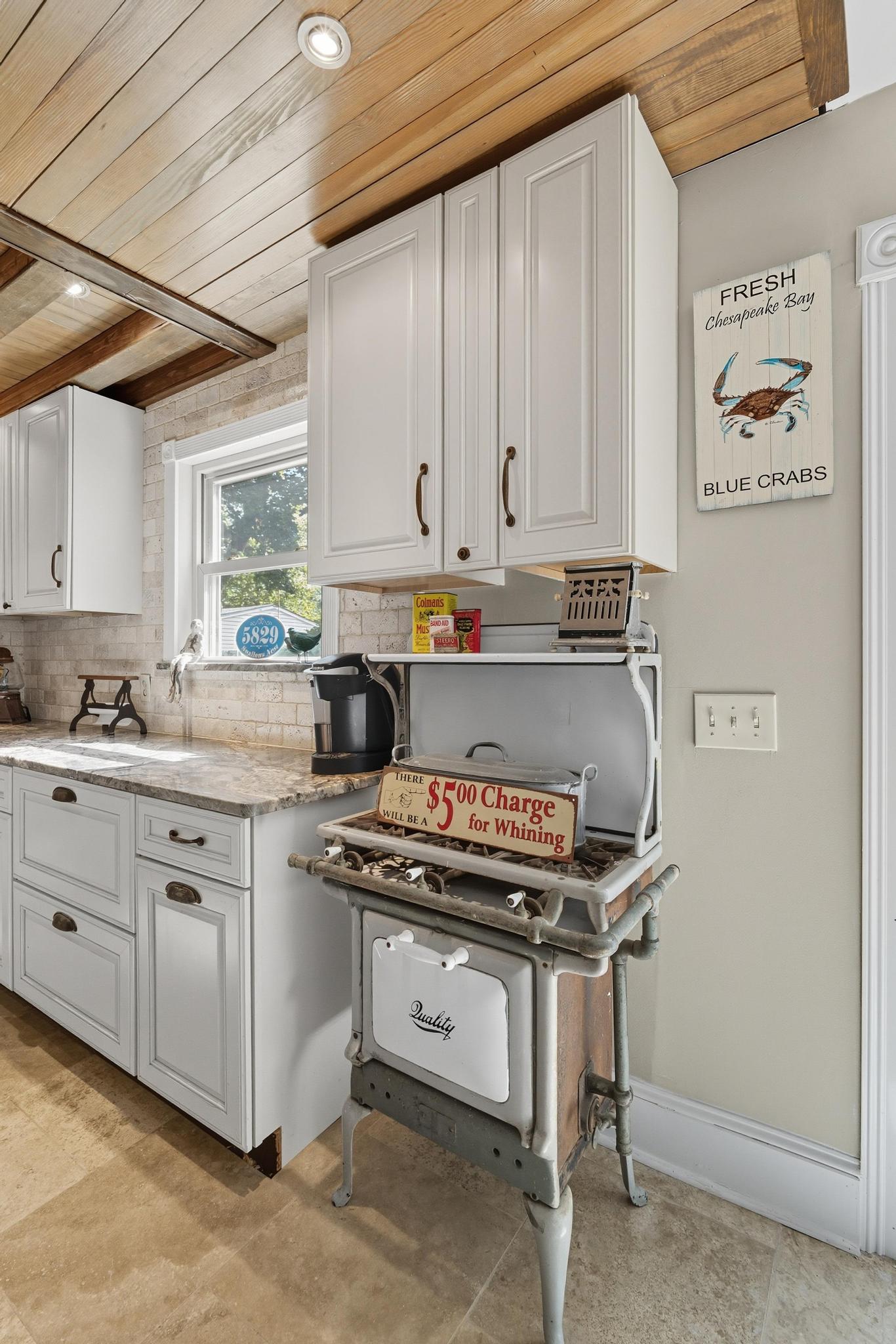 A splash of personality finds its way into the kitchen through floral-cushioned bar stools and woven window shades