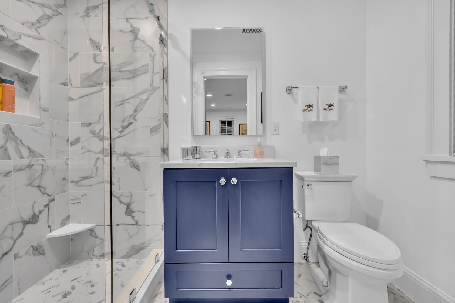 The Owner cleverly incorporated space from the adjacent storage area next to the former half bath and the compact space is now a full bathroom. The veining of the shower surround complements the blue of the lavatory cabinet and the frameless mirror seems to float in the space.