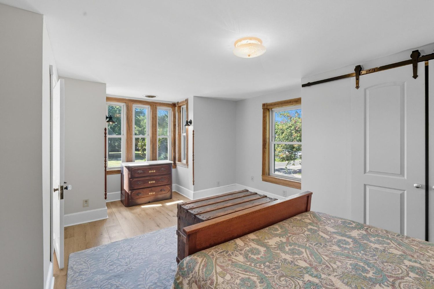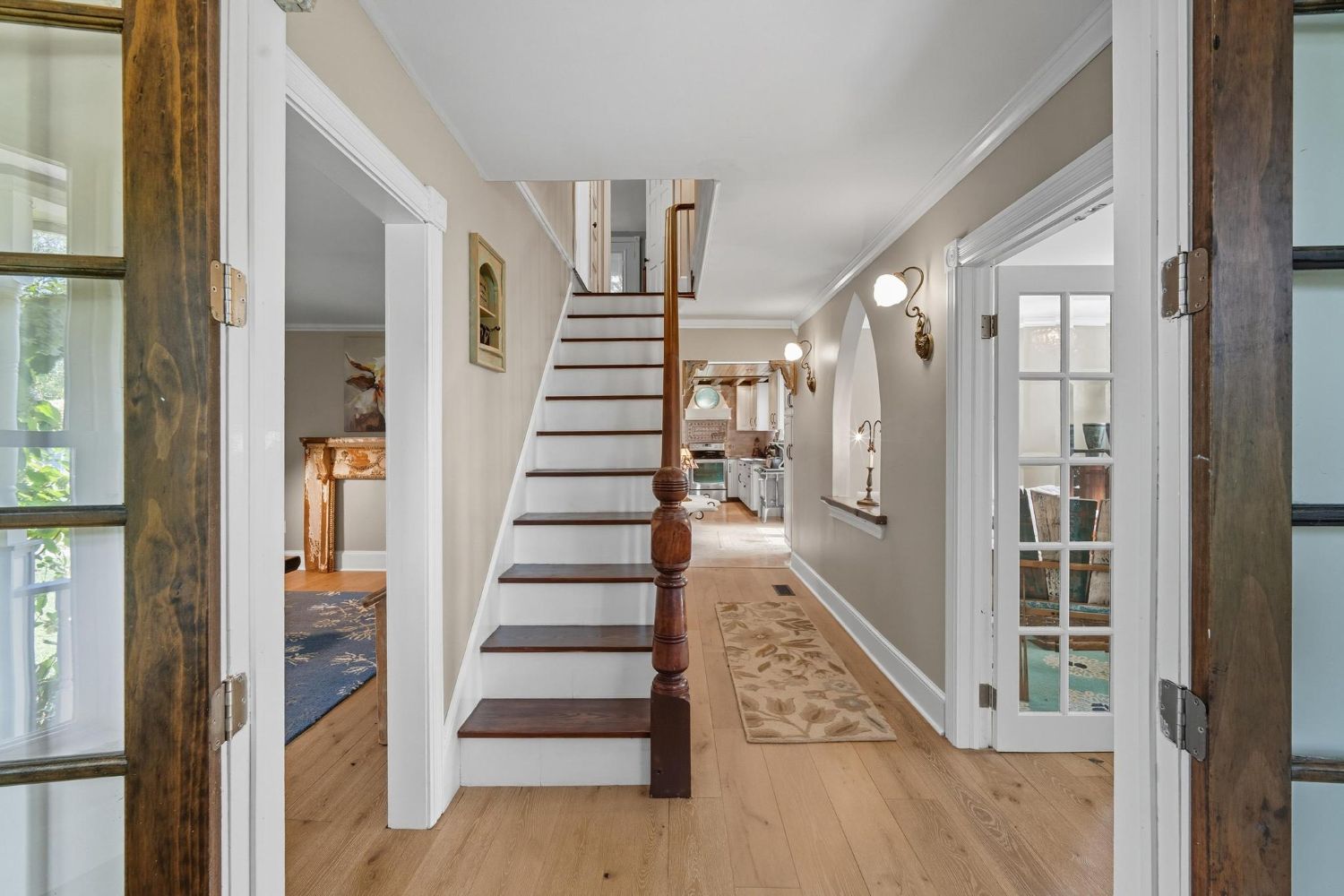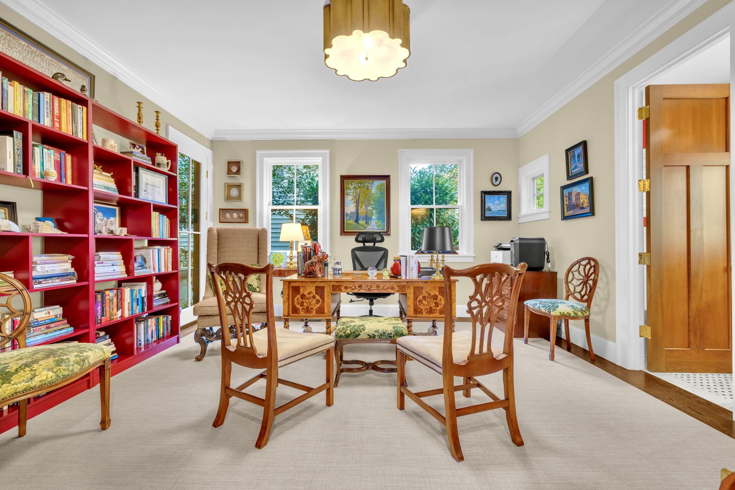 The main floor layout of this house contains this flexible space with an adjoining bath that could be a primary suite or an office as this Owner needs. The former black millwork with identical bays now has adjustable height shelves and bright coats of red as an accent for the room. I admired the harmonious mix of the millwork, Chippendale chairs and the beautiful original craftsman style door to the adjacent bathroom.