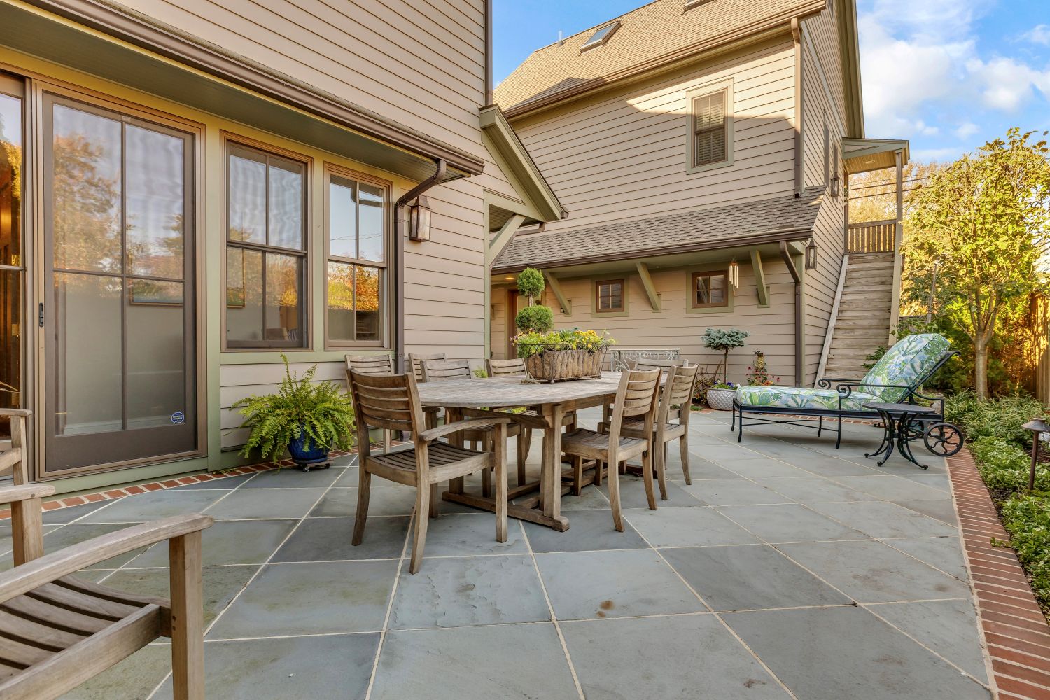 Diagonal bluestone paired with a red brick border brings bold contrast and dimension to the updated terrace.