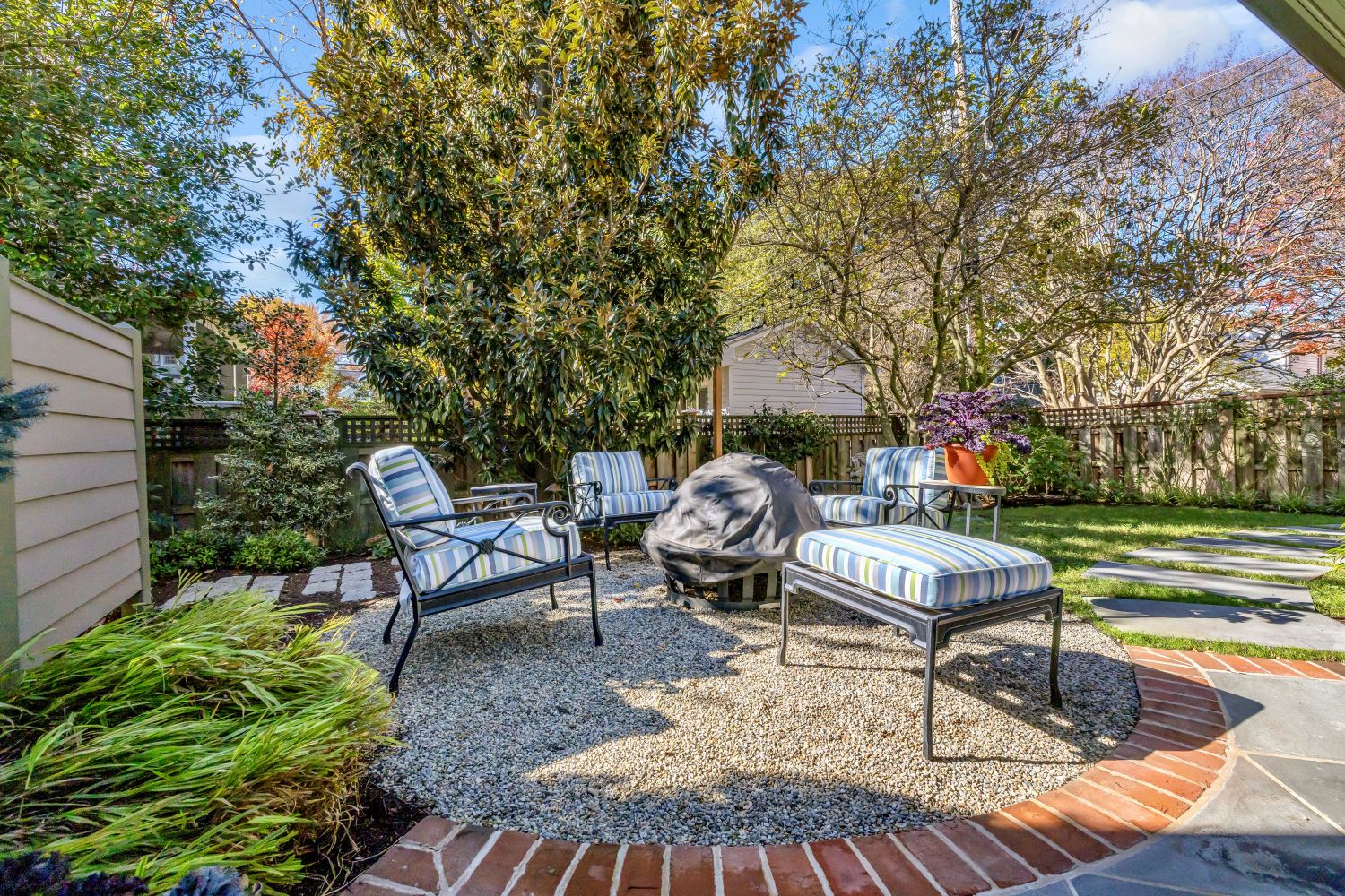 I discovered that the terrace now ends at a new outdoor room of a fire pit outlined by a brick border that encloses the gravel. The easy care iron seating with cushions set the scene for nocturnal gatherings around the firepit-Smores anyone? New trees and shrubbery were spaced along the wood fence to both break up the length of the fence and to add texture and color.