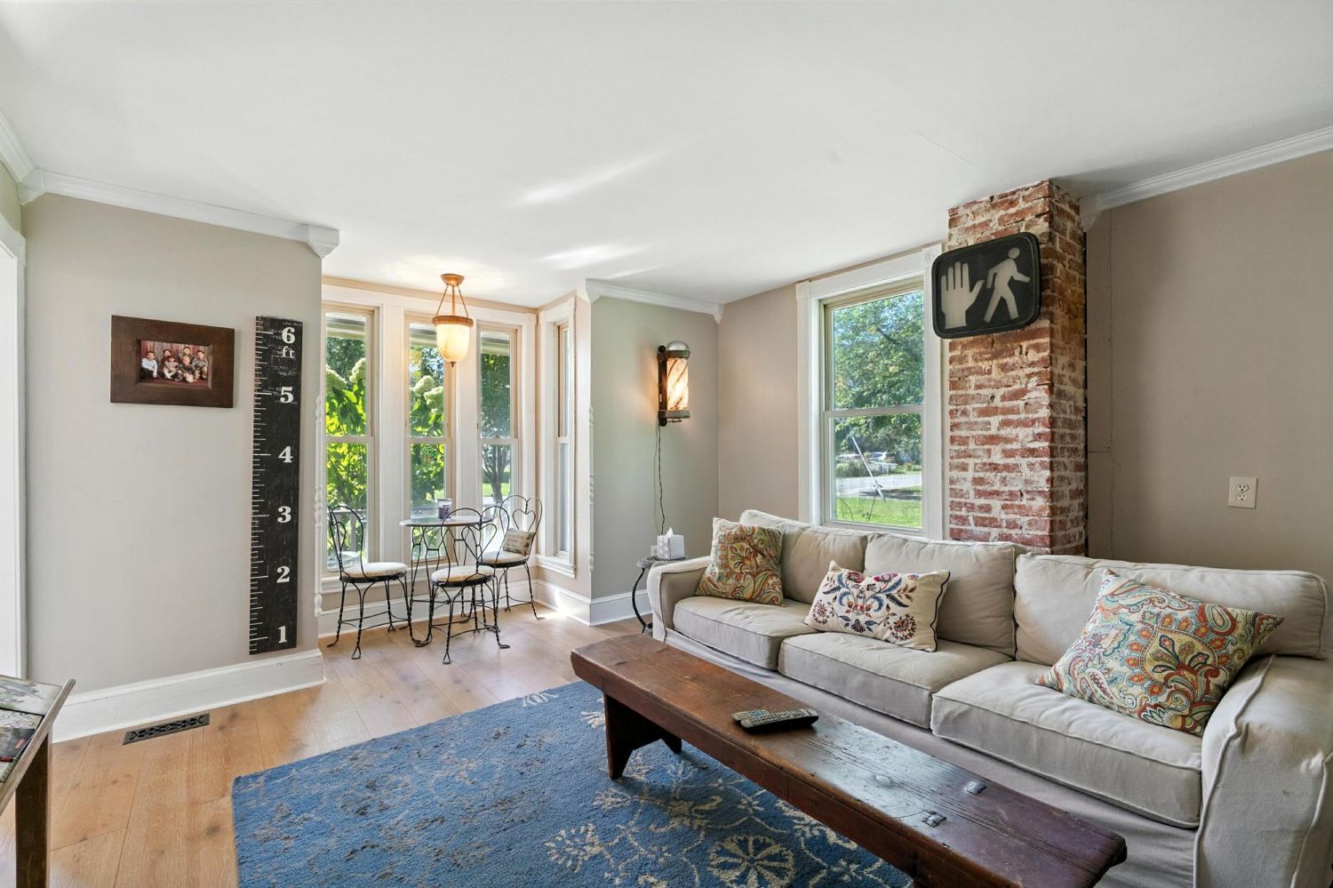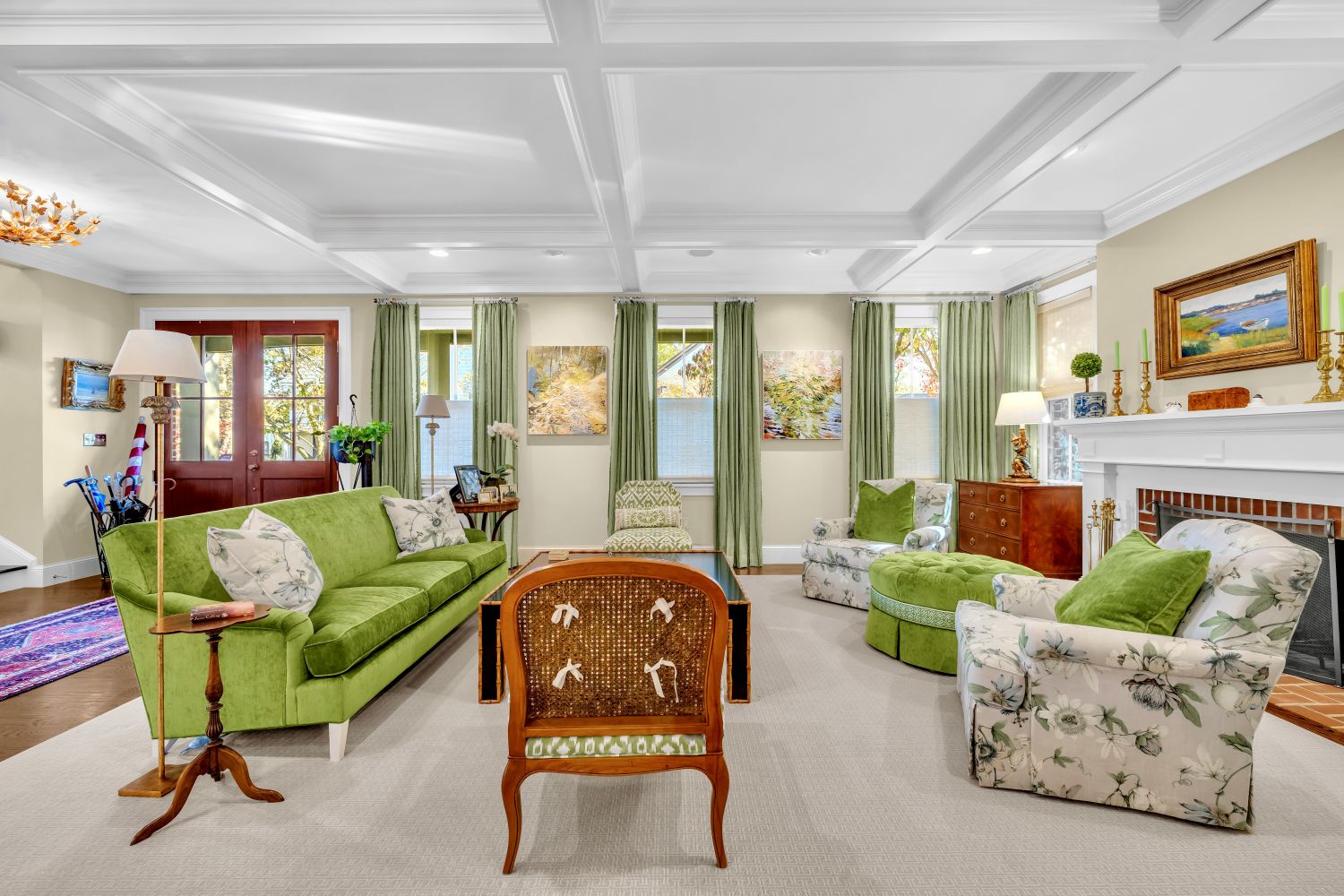 Coffered ceilings refreshed with white paint and modern lighting bring a brighter, timeless appeal to the living area.