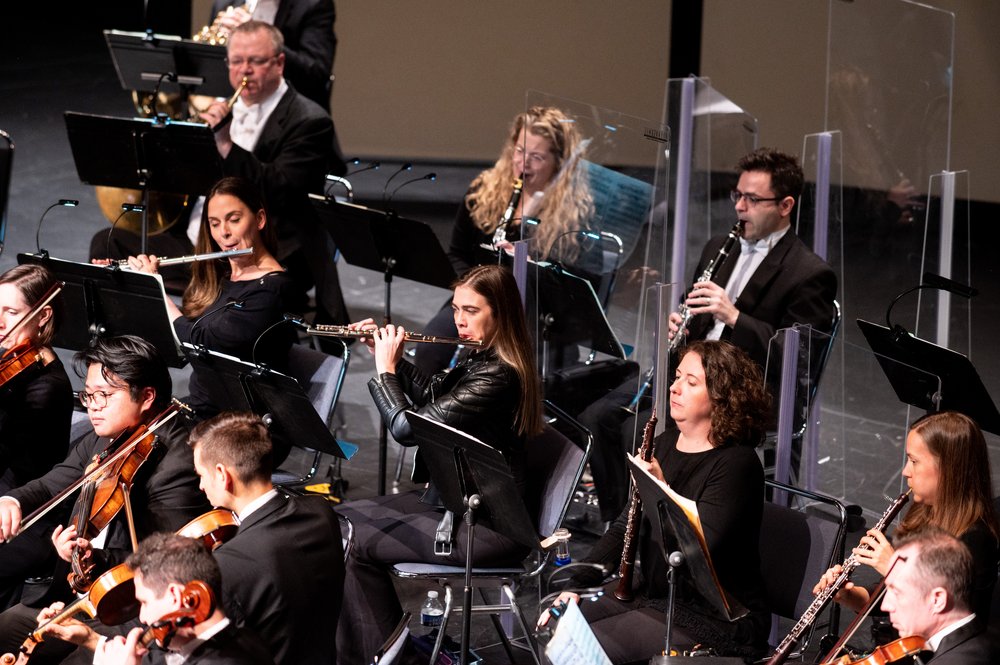 The opening of Mozart’s Symphony No. 39, written at a feverish pace with two other of his late symphonies, demonstrates how far ahead of his time Mozart was regarding clarinets. Barely accepted as an orchestral instrument in his time, the clarinet is prominently featured in what’s also known as his “Eb” symphony, led in this concert by Brian Tracey along with Eric Black. The melodically stated introduction morphs into a pastoral-themed, violin-led allegro echoed by the horns and oboe principal Dana Newcomb. A slower A-flat movement follows with elaborations of earlier themes, concluding with a lively minuetto with a clarinet solo liberally sprinkled with flute accompaniment led by Mindy Heinsohn.