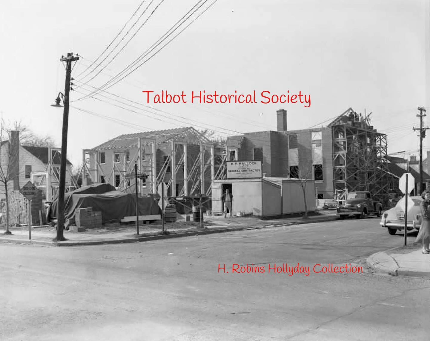 Another mystery to be solved! What is this complex of buildings that was built c. 1940s or 1950s? Just found from its high-resolution image at the Talbot Historical Society that the corner sign says Idlewild Ave. and Hanson Street! We know H. F. Hallock was the General Contractor for the project and that it was built at a school crossing. My first thought was the First Baptist Church in Easton, but the building’s roof line, which is built further back, doesn’t match. It also appears that a third big building is being constructed closer to the corner. P.S. From the larger scan, it becomes clear that the framed construction is the central part of the Baptist Church that faces Idlewild Ave.