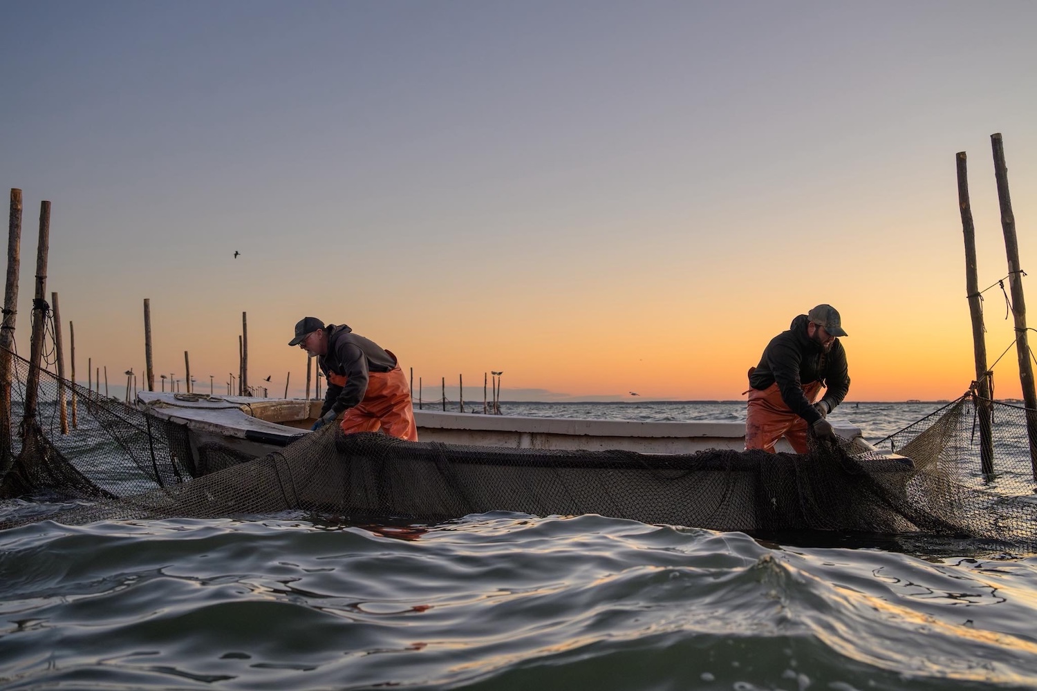Burl Lewis and Jamie Fisher tend their pound nets in the pre-dawn light carrying on a time-honored fishing tradition. “Tradition” by Michale Dreese.