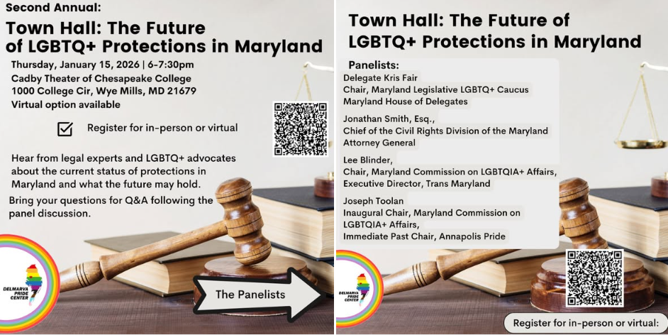 The Delmarva Pride Center will host the Second Annual Town Hall: The Future of LGBTQ+ Protections in Maryland on Thursday, January 15, from 6:00 to 7:30 p.m. at the Cady Theatre at Chesapeake College.