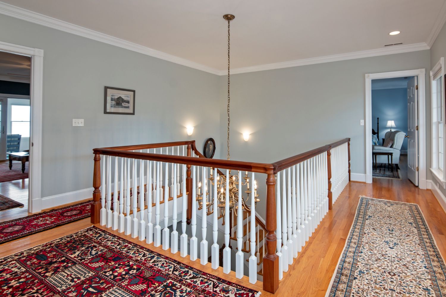The second-floor landing connects private bedroom suites with access to the expansive front balcony.