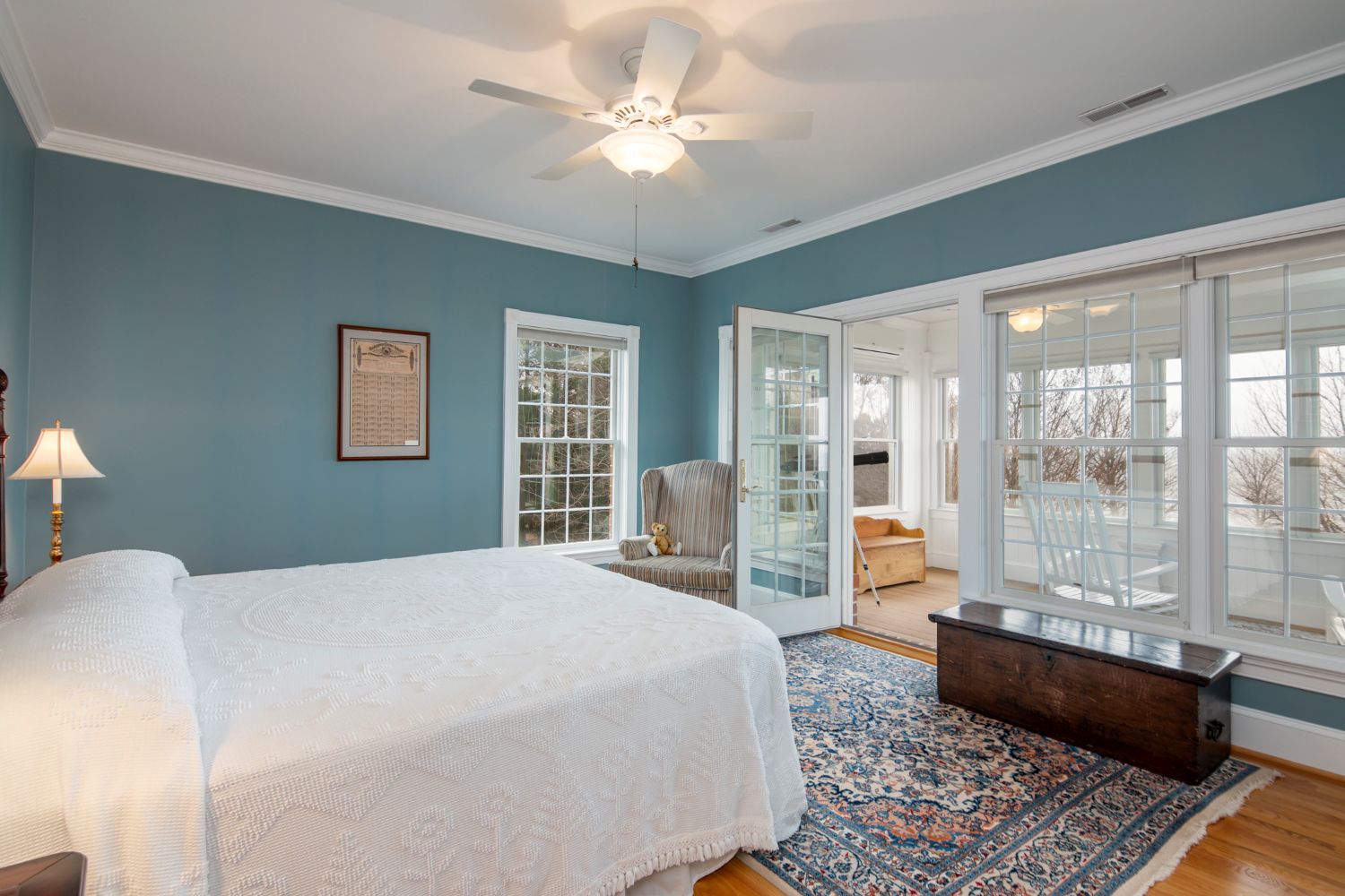 French doors and long windows create seamless continuity between sleeping quarters and an enclosed porch.