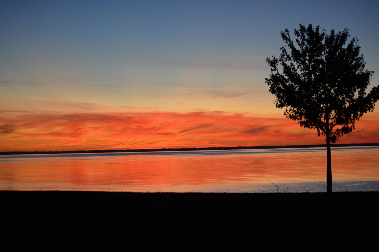 Just like the famous Monterrey, CA lone cypress, this lone tree stands guard at the top of the riprapped shoreline as the sun sets over the horizon.