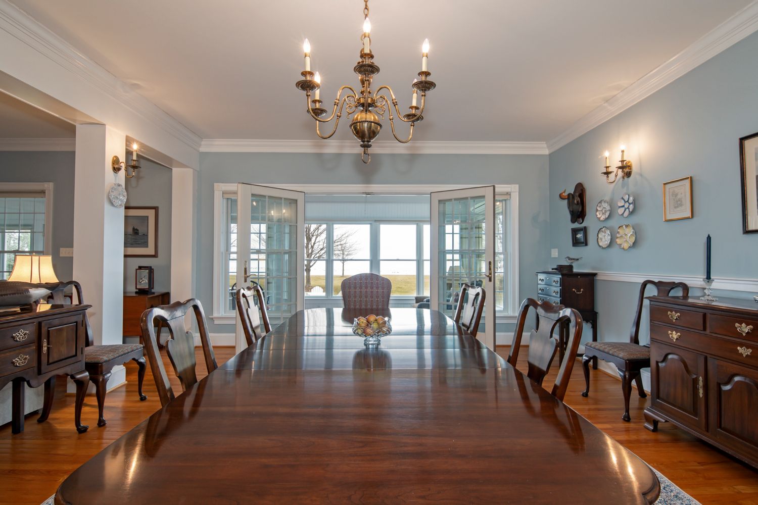 The dining room’s table is on axis with the rear wall’s pair of French doors and long windows that provide a stunning view of the lawn and the water. I admired the beautiful antiques and I imagined how many happy family holiday dinners or other celebrations have occurred around the beautiful table. The graceful Georgian chandelier is the perfect finishing touch.