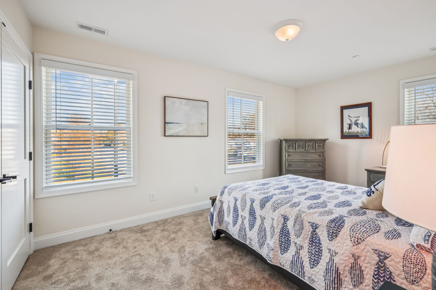 Another guest bedroom is located at a corner of the unit so it has three windows on two walls for abundant daylight. All of the bedrooms are carpeted for quiet.