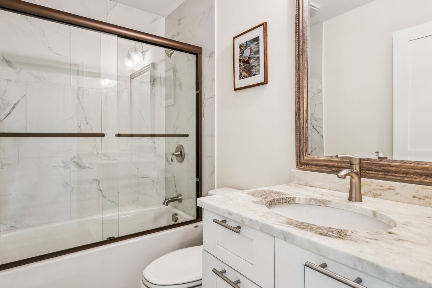 The compact hall bath’s interior design of white cabinets, warm bronze hardware and fittings creates an inviting space. The combination tub/shower has sliding glass doors with a deeper bronze frame to complete the sleek look.