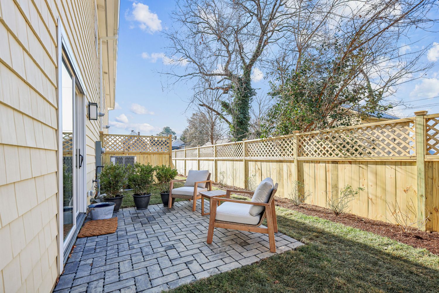 One side yard has been transformed into private outdoor rooms for both units enclosed by high fences. I especially liked how the wood fence was detailed with bays of both lower solid panels for seated privacy, topped with lattice panels to soften the enclosure. The grass stops short of the fence so future plantings can add color and texture. Along with the same hardscape pavers used for the parking areas, the demising fence wall defines the terrace area for each unit.