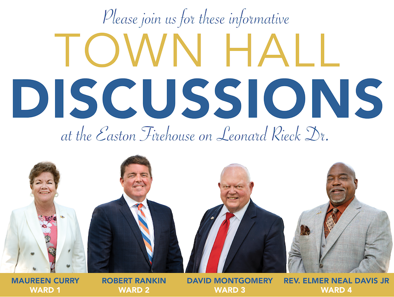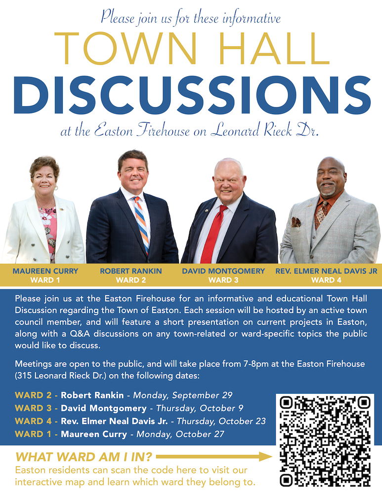 In the coming weeks, each Town of Easton Ward representative will host a Town Hall Discussion open to the public. The discussions will serve to inform and educate the public on current and upcoming Town projects, and to have an open forum for public feedback.