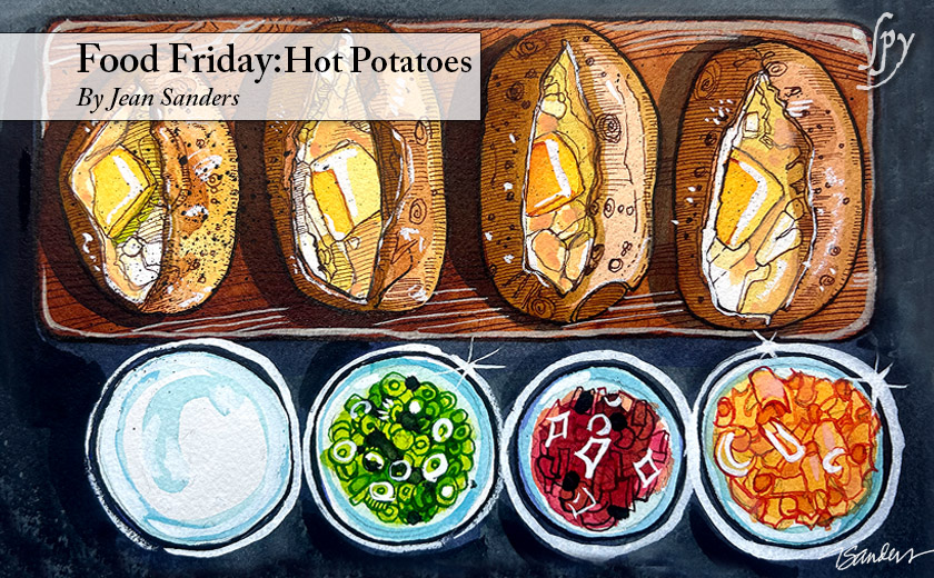 In the UK they turn potatoes into atmospherically named dishes: bangers and mash, shepherd’s pie, cottage pie, Cornish pasties, bubble and squeak, not to mention the exquisite chipped potato. The best British chips come from chippies – shops devoted to the fine art of deep frying chipped potatoes. I cannot understate the sheer glory of a perfectly crisp, furnace-hot chip, dusted with salt, put steaming in its paper nest, but I must not rhapsodize in the middle of a think piece about baked potatoes. Hot chips (and fries) are perfection. Add vinegar if you must. To each his own. Fries