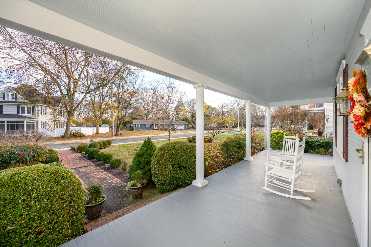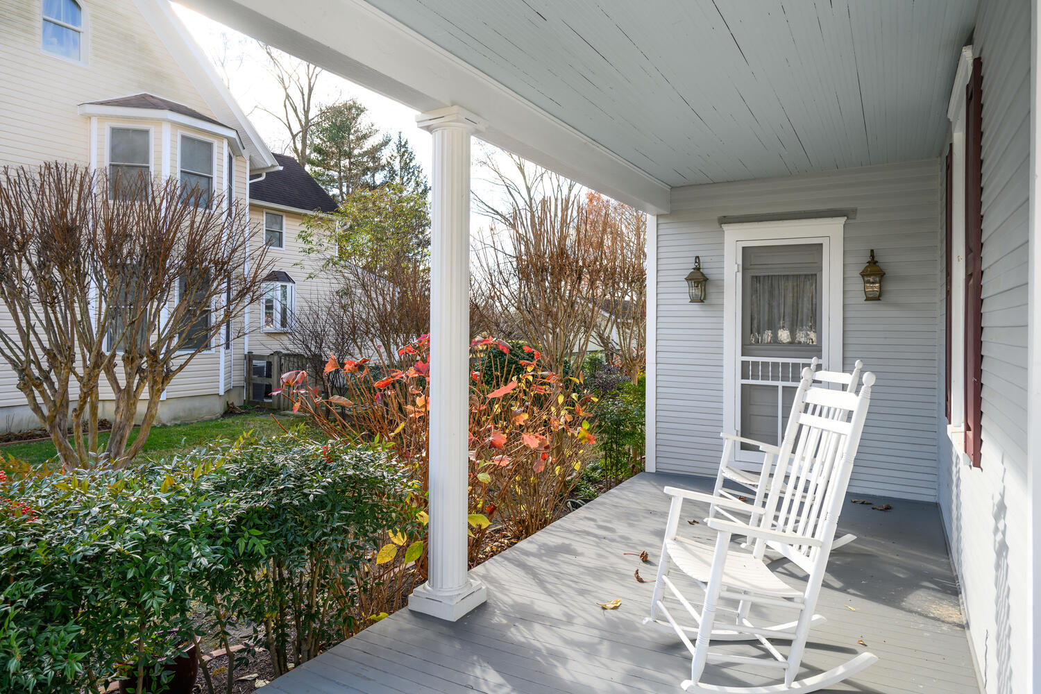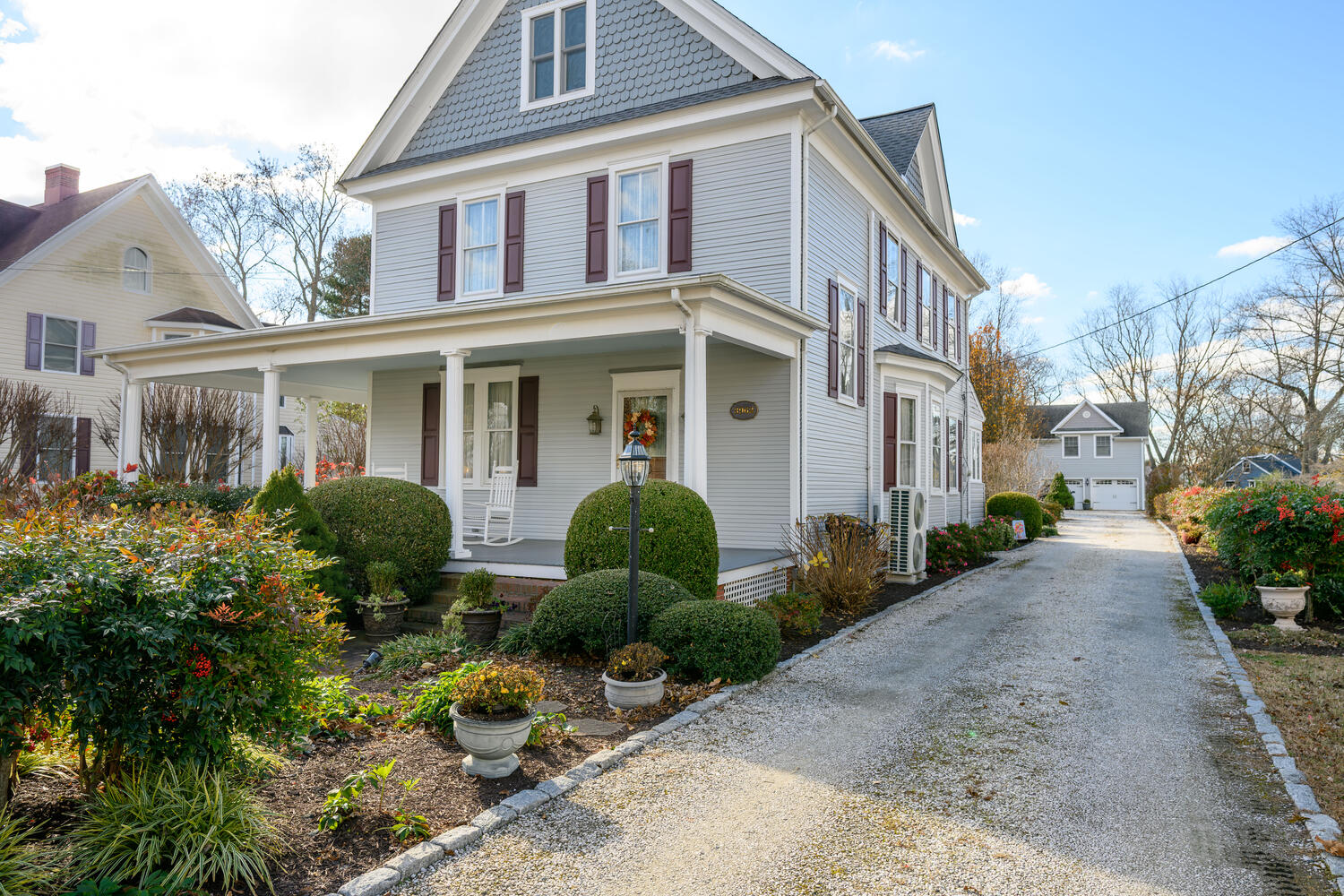 Several of my friends who wanted to purchase historic houses and found Easton’s Historic District too costly have discovered Trappe. Being a history buff, I am always curious to know the origin of a town’s name. I learned Trappe was incorporated in 1827 and its name may have been inspired by either wolf traps or a Trappist Monastery. This charming house caught my eye several years ago when I featured another House of the Week that was located across the street and I am so pleased to feature this house today. The long and deep lot is located in the heart of Trappe’s residential district and the house and landscaped grounds have been lovingly maintained by its current owner who purchased it from the original owner. As I walked up the driveway for my tour, I admired the original lap siding that has been meticulously sanded down and repainted so it looks like new. The two-bay, two room wide, four rooms deep house’s multiple gables, wrap-around porch, 2/2 windows and bay windows identify its blend of Queen Anne and Victorian styles.