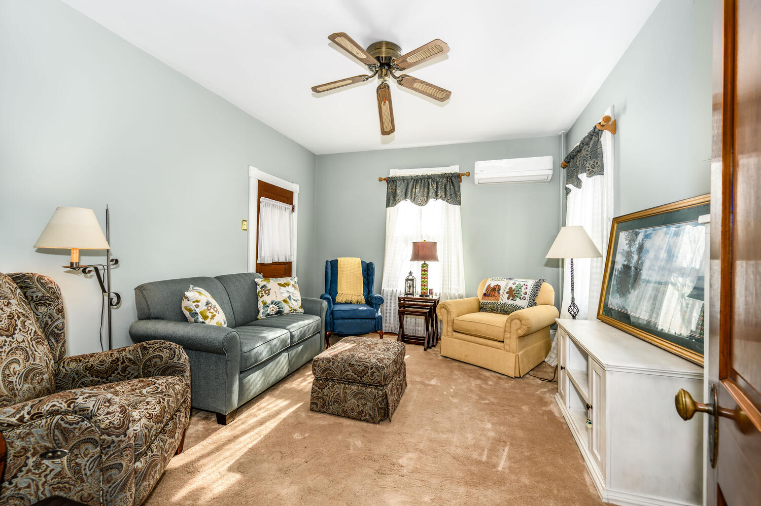 A stained wood French door leads from the foyer into the living room that was probably the formal parlor of the house when it was built. The windows at the corner look out onto the wrap-around porch. The spacious room easily accommodates seating for a gathering of family or friends.