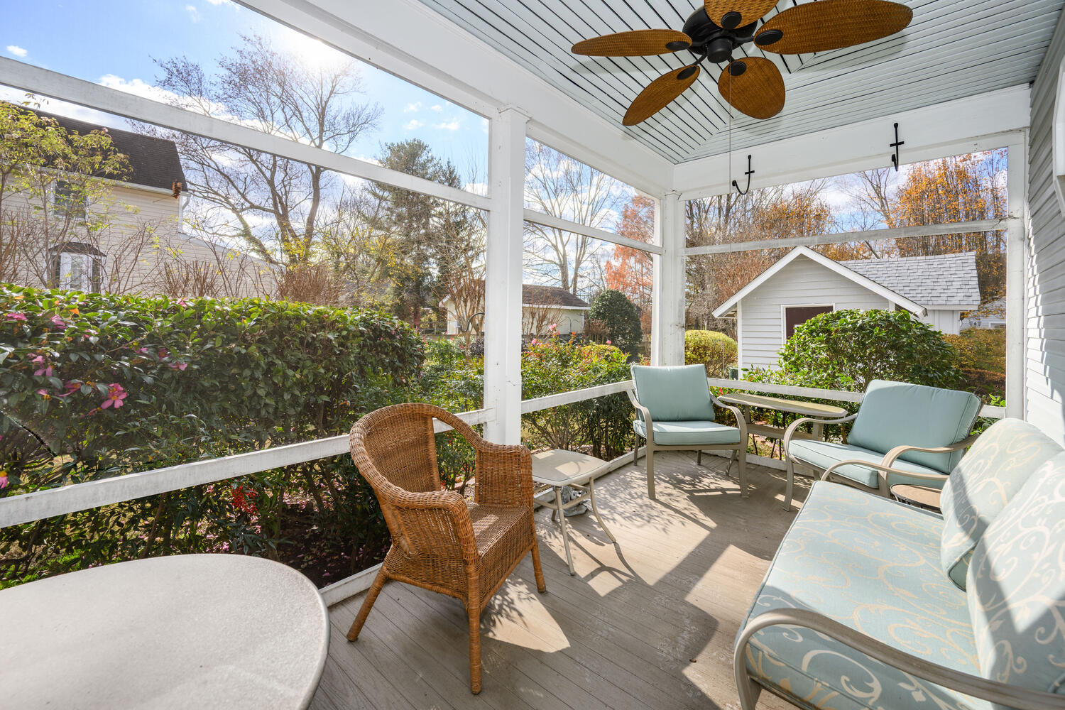The cozy screened porch is a perfect Snug for relaxing at the end of the day or for warm weather meals. Hedges provide seated privacy and the framing of the screened panels maximizes one’s view of the landscape and the garden shed beyond. Behind the screened porch at the rear of the house is a full bath and laundry and a mud room with an exterior door to the driveway and gardens.
