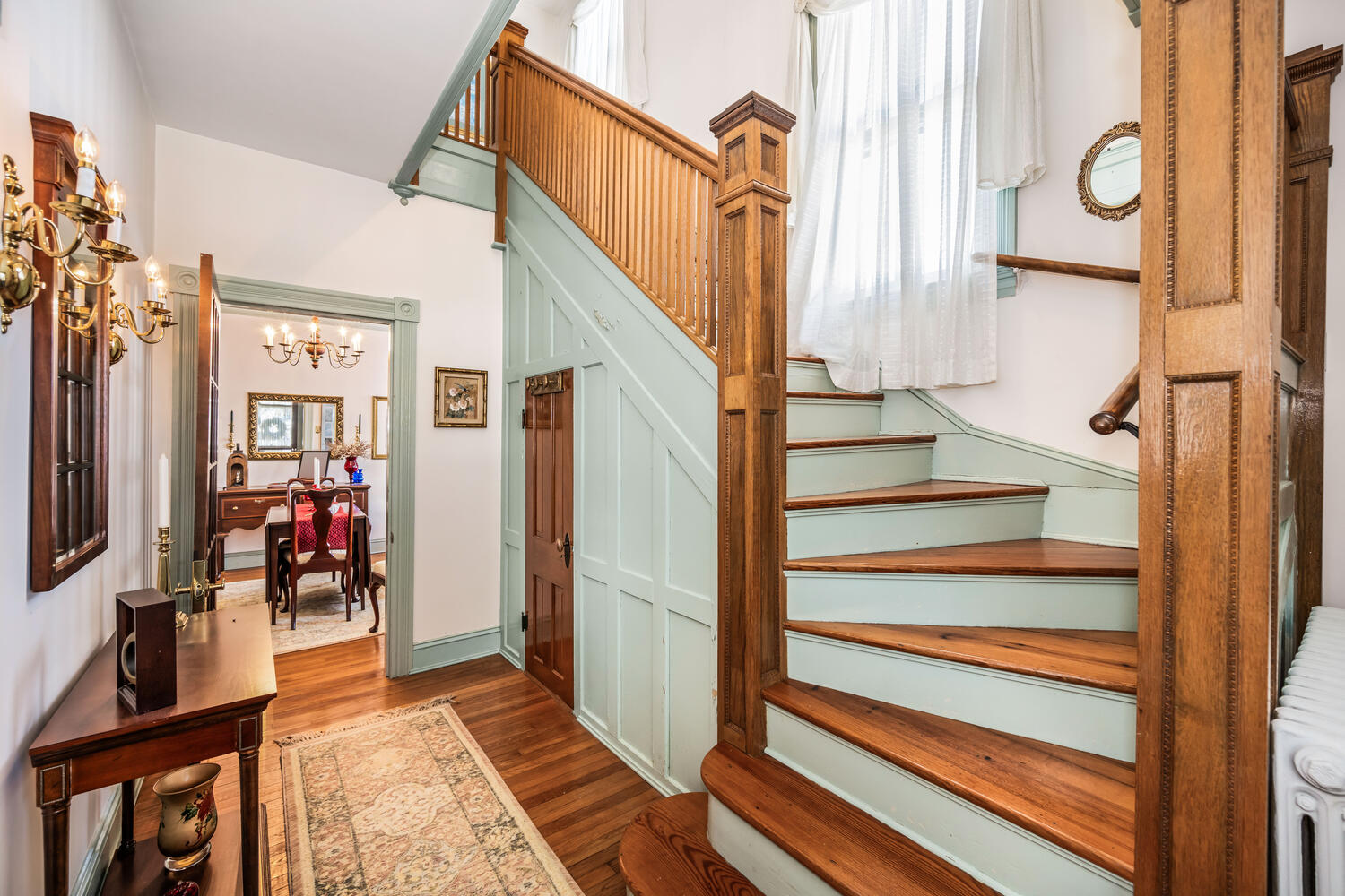 Original oak balustrades and curved stair detailing highlight craftsmanship from the home’s early 20th-century origins.