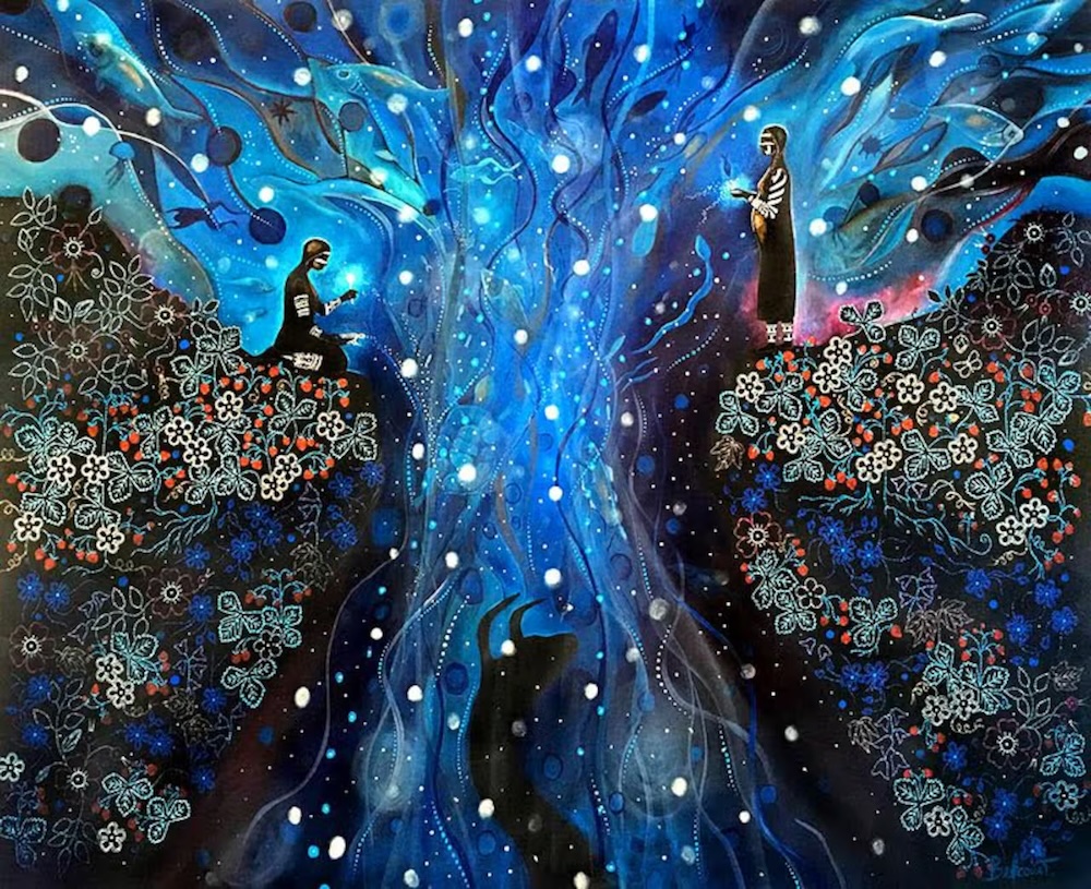 Belcourt continues to paint in her unique style, and she continues to add text for the viewer. In “Offerings to Save the World” (2017) (72’’x55’’) her focus once again is on water, and this time the painting takes on a mystical theme. Water spouts arise from the bottom of the canvas to reach the sky. Interwoven with the blue sky and water are stars, fish, and frogs. Two spiritual indigenous figures are placed on either side of the water. They bring offerings and pray. They sit and stand upon an abundance of flowers. A dark female figure appears to rise from the water.