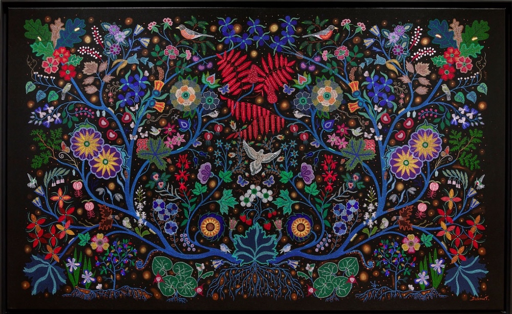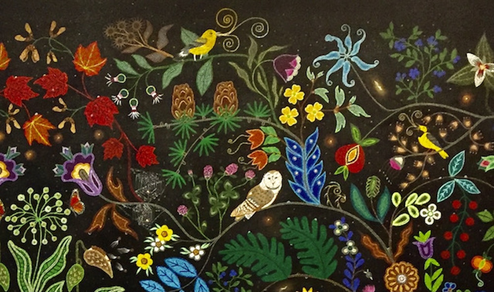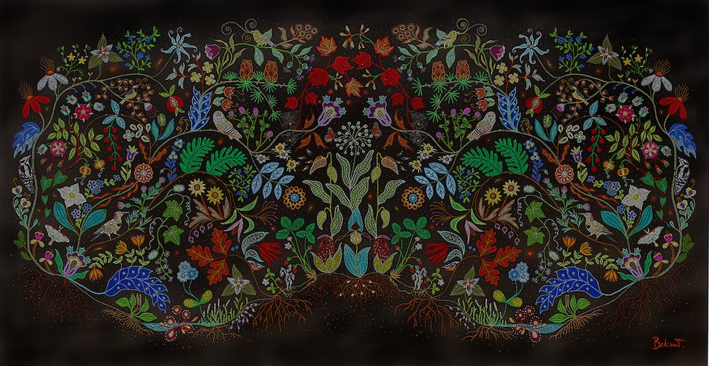 Belcourt received the Ontario Arts Council Aboriginal Arts Award in 2014. “Wisdom of the Universe” (2014) (67×111’’) represents plants and animals that are on the endangered species list: Dwarf Lake Iris, Eastern Prairie Fringed Orchid, Karner Blue Butterfly, West Virginia White Butterfly, Spring Blue-eyed Mary, Cerulean Warbler, and Acadian Flycatcher. Belcourt writes stories or comments to go with many of the works. She wrote about this piece: “Globally, we live in a time of great upheaval. The state of the world is in crisis. We are witness to the unbearable suffering of species, including humans. Much of this we do to ourselves. It is possible for the planet to return to a state of well-being, but it requires a radical change in our thinking. It requires a willingness to be open to the idea that perhaps human beings have got it all wrong. All species, the lands, the waters are one beating organism that pulses like a heart. We are all a part of a whole. The animals and plants, lands and waters, are our relatives each with as much right to exist as we have…Perhaps it’s time to place the rights of Mother Earth ahead of the rights to Mother Earth.”
