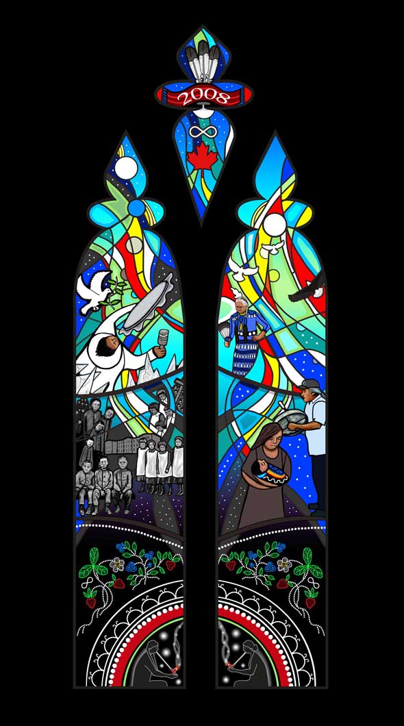 “Giniigaaniimenaaning (Looking Ahead) (stain glass window) (2012), located in the Centre Block of the Parliament Building of Canada, represents the 2008 apology of the Canadian government to the indigenous people of Canada for the policy of placing children in Indian residential schools. The top panel includes the date 2008 and a female shape that integrates the Canadian maple leaf and feathers. The left panel includes the image in white of Phil Fontaine, the Grande Chief of the Assembly of Manitoba Chiefs, holding a drum and drum stick. In 1990, he was the first to speak out about his life in the residential school. Others began to speak out, and reconciliation began, represented by the white dove holding the olive branch. The shattered glass represents the lives that were shattered. The middle section, largely created in black and white glass, represents life in the schools. The top right side of the window commemorations the Apology to former students offered by Canadian Prime Minister Stephen Harper on June 11, 2008: “I am filled with optimism… a new day has dawned, a new day heralded by a commitment to reconciliation and building a new relationship with Inuit, Métis and First Nations.” The lines represent rays of sunshine. Doves and an eagle fly upward as if toward the future. A tribal elder wearing a “jingle dress” represents healing. The colors yellow, black, white, red, green, and blue are the colors used in medicine wheels, the sun dance, and lodges. The grandfather sings a traditional song to signify the restoration of the songs, dances, ceremonies, and languages of the people. The mother and child illustrate the return to traditional child rearing. At the bottom of both panels, the circle has been connected and is complete. Grandmothers sit in their lodges and smoke peacefully as traditions are restored. The strawberries hold a significant place in Metis culture as they are the first fruits of a new spring and represent a new beginning.