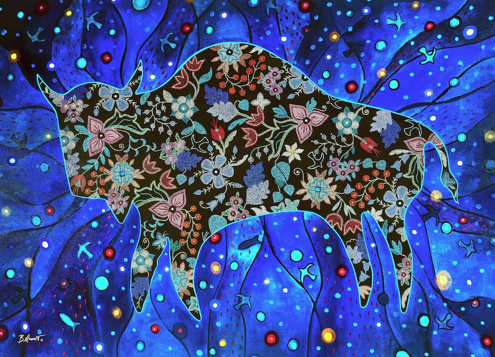 “The Earth is My Government” (2017) (51’’x72’’) expresses another of Belcourt’s responses to the world in which she finds herself. The deep blue of the water and sky contain stars, birds, and fish. The spirit of the buffalo that had provided for many of the needs of indigenous people over hundreds of years also resides in this blue world. The buffalo shape contains the flower beading of the Metis. The Metis people were not recognized by Canada as indigenous peoples until 1982 in Section 35 of the Constitution Act. They finally obtained the right to self-government in 2019. Belcourt’s saying that the earth is my government can be understood better in these circumstances.