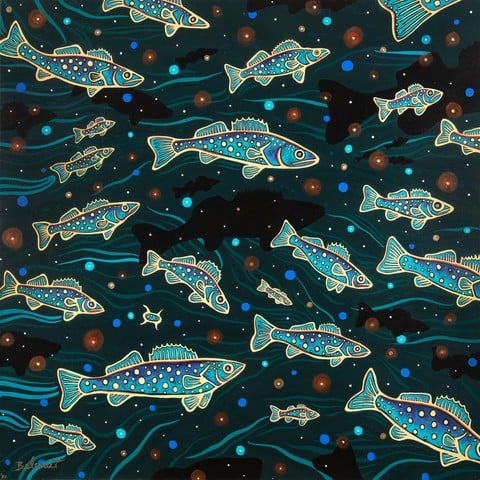 “I Envy Their Freedom” (2020) (31”x31’’) reminds viewers how important water is to the world. The title is understandable in light of Belcourt’s continued battle to save the future of Earth. Rest is needed to continue the fight. Her process is a type of meditation. Each painting is meticulously executed with tiny dots, requiring an extraordinary amount of time and concentration, resulting in calm.