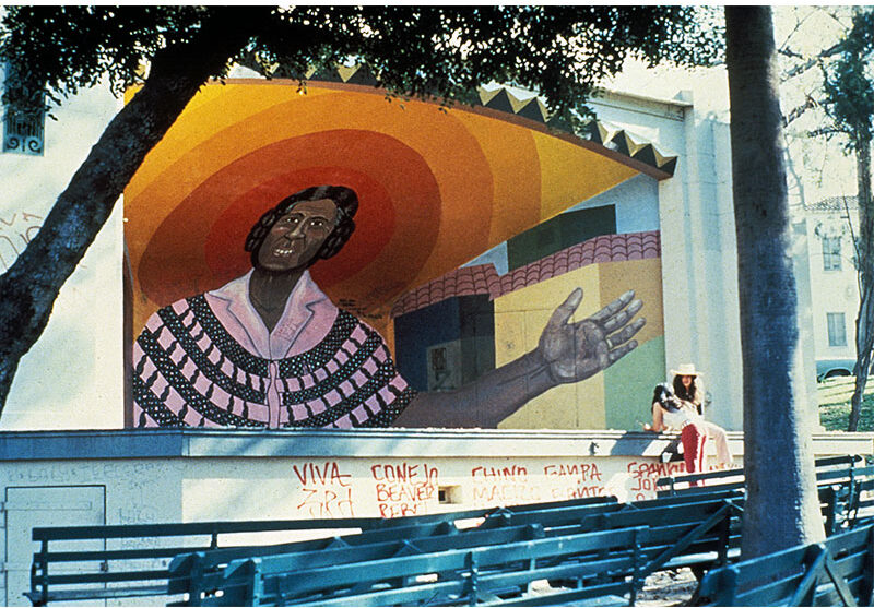 In the summer of 1970, Baca brought together twenty young people from four rival gangs in Boyle Heights to paint murals. She had gotten to know them over time, and she wanted to try to create “a public consciousness about people who are, in fact, the majority of the population but who are not represented in any visual way.” The group chose the name Las Vistas Nuevas (New Views). Their first project, “Mi Abuelita” (My Grandmother) (1970) (25’x35’) (acrylic on concrete) was a mural painted on three walls of the outdoor stage in Hollenbeck Park. The mural was based on a photograph of Baca’s grandmother. Her arm outstretched, she offers a welcoming smile and hug to all. Her hairstyle, clothing, the simple city scape, and the sunshine complete the story. Baca chose the simplified drawing and coloring of the Mexican mural tradition she had seen, revered, and studied. Baca stated, “This work recognized the primary position of the matriarch in Mexican families. It also marked the first step in the development of a unique collective process that employs art to mediate between rival gang members competing for public space and public identity.”