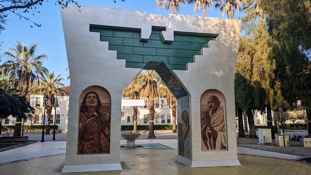 “Arch of Dignity, Equality, and Justice” (2008) was commissioned by San Jose State University as a memorial to Ceasar Chaves, American labor leader and civil rights activist. This was not to be a traditional monument to a fallen soldier, but as Baca stated, “It is not Cesar’s personality that is to be remembered, but his ideals and beliefs.” The arch opening was designed to resemble the Mayan arch with sides slanted toward the center. It was the doorway opening to temples, tombs, and ceremonial buildings. Placed at the top of the arch is a turquoise glass mosaic eagle, the symbol of the United Farm Workers. A ton of glass was specially ordered from Cuernavaca, Mexico, for the mural. Mosaic portraits of Mahatma Gandhi and Dolores Huerta can be seen in this view. Baca included Gandhi to represent non-violence in the fight for human rights. Dolores Huerta was co-founder of the United Farm Workers and an activist and advocate for farm workers, particularly women. She worked to develop legislation for equal human rights. The figures in the niches (each 4’ by 9’) on the other side of the arch are depictions of male and female farmworkers who picked crops in the Salinas Valley.