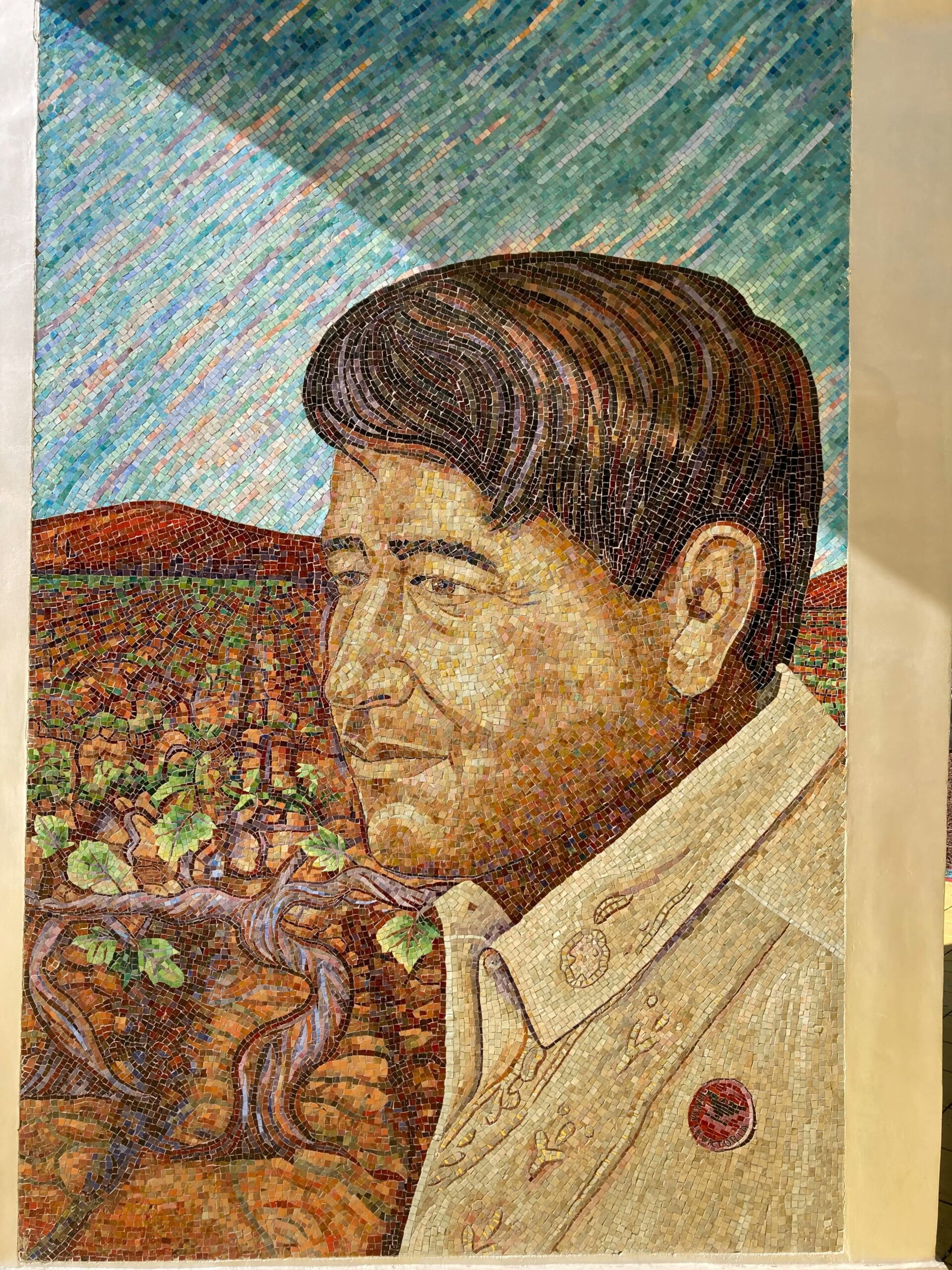 Inside the arch one mosaic is a depiction of Ceasar Chaves contemplating the furrowed field and green leaves of a flourishing crop, also where the boycotts took place. On his shirt is the symbol of the United Farm Workers, a red pin with a black eagle. Above his head, on the slanted panel (not shown), is the Virgin of Guadalupe, the patron saint of Mexico. Mary appeared in 1531 to an Aztec Christian named Juan Diego near what is now Mexico City. The Virgin blesses Chaves. Beneath her image is a skull, representing the death of farmworkers caused by pesticides. Across from Chaves is Robert Kennedy (not shown). On March 10, 1968, Chaves broke a 25-day protest fast and accepted bread from Senator Kennedy. In his speech Kennedy referred to the day as an “historic occasion” and said they were “locked in the struggle for justice for the farmworkers, and the struggle for justice for the Spanish-speaking Americans.” The arch stands next to the Student Union Building to ensure people walk through it. Chaves stated, “A symbol is an important thing, that is why we chose an Aztec eagle. It gives pride…When people see it, they know it means dignity.”