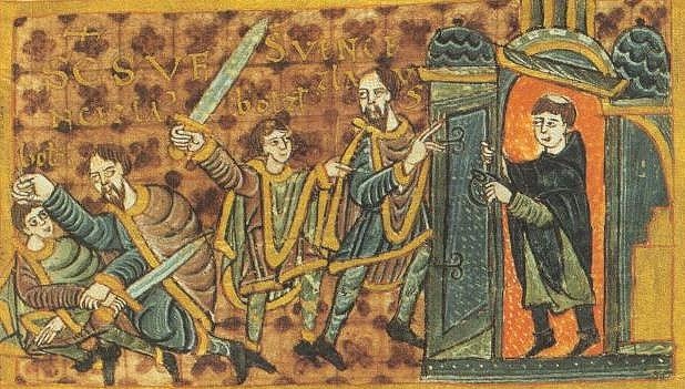 Wenceslas (907-935) (Vaclav the Good) was not a king, but he was the beloved Duke of Bohemia. He was raised as a Catholic by his grandmother Ludmilla. He was known for his concern and care for widows, orphans, and even prisoners. He spread the Christian faith throughout his kingdom, much to the displeasure of his mother and brother Boleslaus the Cruel. “Wenceslaus fleeing from his brother” (1006) is an illuminated manuscript from the Gumpold Codex, commissioned in 980 CE by the Holy Roman Emperor Otto II and his wife. It is a depiction of the murder of Wenceslaus on September 28, 905 by his brother and others on his way to pray in the chapel. The final blow was delivered by his brother. In the illustration, Wenceslaus tries to escape into the chapel, but the priest closes the door. September 28 was declared his feast day and is celebrated in the Czech Republic, Bohemia, and Slovakia. Wenceslas was declared a saint by the people of Bohemia immediately after his death, and the Holy Roman Emperor, Otto I, declared him be a king.