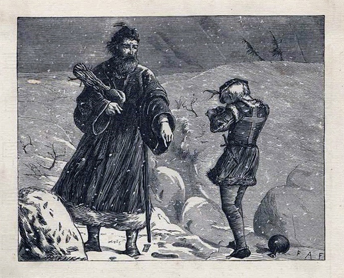 “Good King Wenceslas” (1879) is an engraving by the Brothers Dalziel. Their engraving company, founded in London in 1839, worked with such artists as Whistler, Rossetti, and Lewis Carol. The engraving was included in a hymn book published by Henry Ramsden in 1879. King Wenceslas and his page are shown trudging through the snow carrying food and aid to the poor people of Bohemia. In verse four, the page, about to collapse, says: