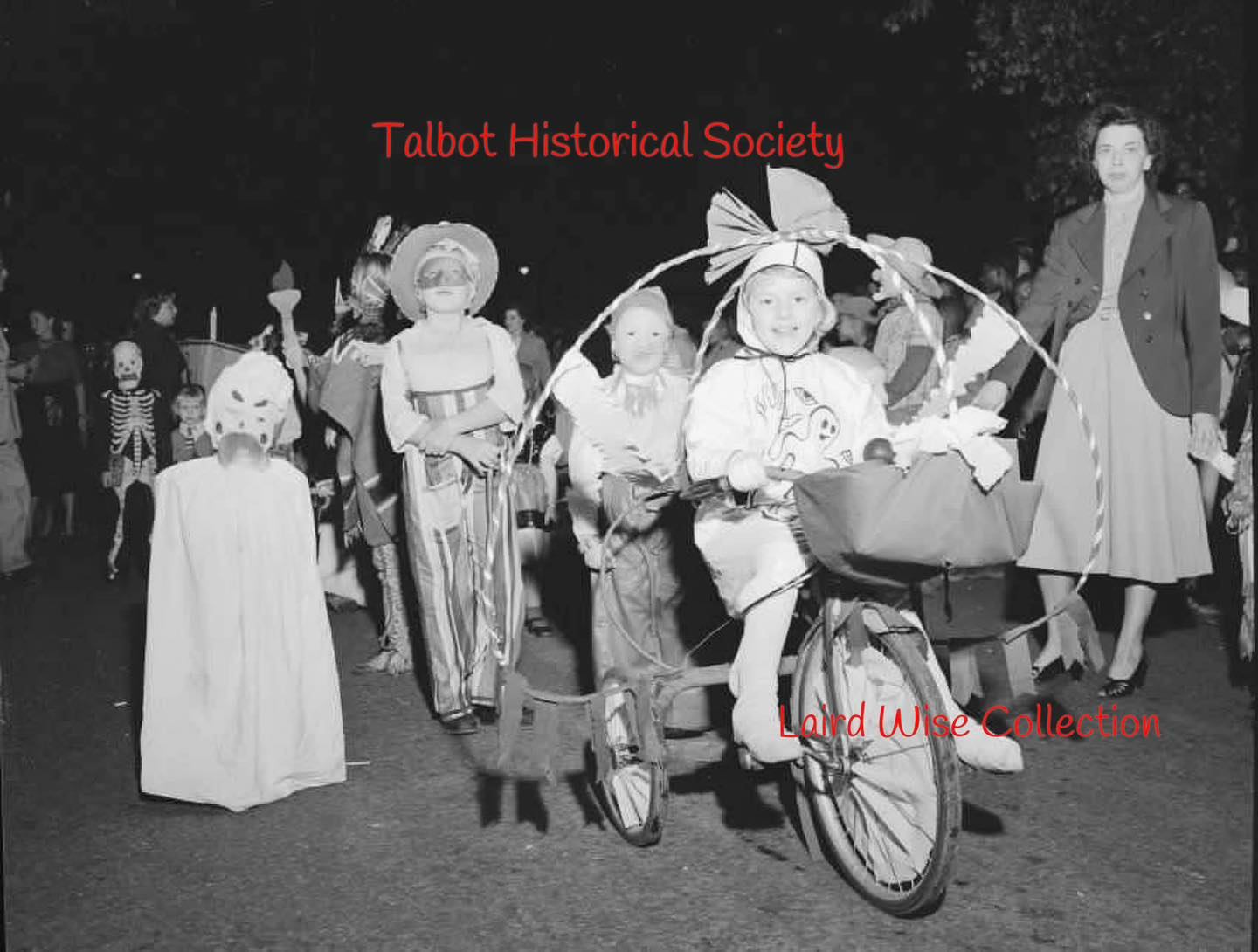 Happy Halloween! Do you recognize anyone in this Talbot Historical Society Laird Wise Collection photo of an Easton, Maryland Halloween Parade? The photo was taken on the corner of Washington and Dover Streets, c. 1950s or 1960s? What is the little girl on the tricycle dressed as? The origins of Halloween date back to a Celtic festival called Samhain, which marked the end of the harvest approximately 2,000 years ago. The Celts believed it was a time when spirits of the dead roamed the earth. The Celts wore costumes to disguise themselves from the spirits. Later in the 8th century Christians named November 1st All Saints Day to remember the dead and Oct. 31st became All Hallows Eve which was later shortened to Halloween.