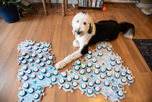 Using paw-sized push buttons placed on the floor (usually attached to a mat and labeled), dogs can communicate with their humans by pressing the button with their paw. Their humans label the buttons by speaking a word for each. Then their dogs can press a button to communicate their need. For example, the human creates a “potty” button, and dog presses that button when it needs to go out.